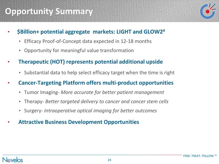 GLOW2 Initial Human Trial Phase I, Breast Cancer Surgery FIND . TREAT . FOLLOW . ™ 23 • Trial design • Dose - ranging multi - site, ~ 2 0 patients undergoing lumpectomy • Compatible with standard of care (SOC) – only addition is GLOW2 administration and non - invasive optical imaging • Primary tumor and sentinel node resected according to SOC • Optical imaging used to assess GLOW2 illumination of any remaining tumor margin or nodal involvement • Trial objective • Demonstrate superiority versus current SOC to identify and differentiate malignant and non - malignant tissue during surgery based on pathology readout