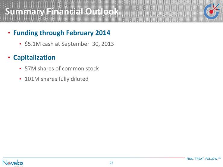 Opportunity Summary FIND . TREAT . FOLLOW . ™ 24 • $Billion+ potential aggregate markets: LIGHT and GLOW2 4 • Efficacy Proof - of - Concept data expected in 12 - 18 months • Opportunity for meaningful value transformation • Therapeutic (HOT) represents potential additional upside • Substantial data to help select efficacy target when the time is right • Cancer - Targeting Platform offers multi - product opportunities • Tumor Imaging - More accurate for better patient management • Therapy - Better targeted delivery to cancer and cancer stem cells • Surgery - Intraoperative optical imaging for better outcomes • Attractive Business Development Opportunities