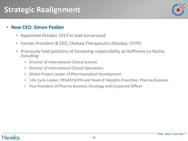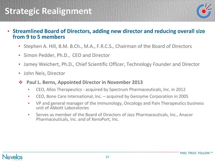 Strategic Realignment FIND . TREAT . FOLLOW . ™ 26 • New CEO: Simon Pedder • Appointed October 2013 to lead turnaround • Former President & CEO, Chelsea Therapeutics (Nasdaq: CHTP) • Previously held positions of increasing responsibility at Hoffmann - La Roche, including: • Director of International Clinical Science • Director of International Clinical Operations • Global Project Leader of Pharmaceutical Development • Life Cycle Leader, PEGASYS/IFN and Head of Hepatitis Franchise, Pharma Business • Vice President of Pharma Business Oncology and Corporate Officer