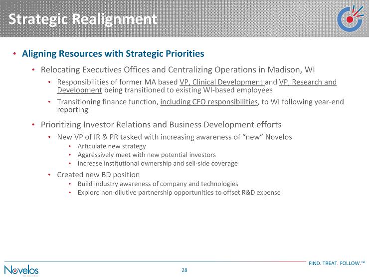 Strategic Realignment FIND . TREAT . FOLLOW . ™ 27 • Streamlined Board of Directors, adding new director and reducing overall size from 9 to 5 members • Stephen A. Hill, B.M. B.Ch., M.A., F.R.C.S., Chairman of the Board of Directors • Simon Pedder, Ph.D., CEO and Director • Jamey Weichert, Ph.D., Chief Scientific Officer, Technology Founder and Director • John Neis, Director □ Paul L. Berns, Appointed Director in November 2013 • CEO, Allos Therapeutics - acquired by Spectrum Pharmaceuticals, Inc. in 2012 • CEO, Bone Care International, Inc. – acquired by Genzyme Corporation in 2005 • VP and general manager of the Immunology, Oncology and Pain Therapeutics business unit of Abbott Laboratories • Serves as member of the Board of Directors of Jazz Pharmaceuticals, Inc., Anacor Pharmaceuticals, Inc. and of XenoPort, Inc.