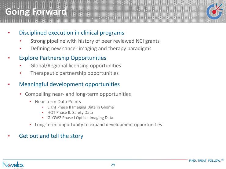 Strategic Realignment FIND . TREAT . FOLLOW . ™ 28 • Aligning Resources with Strategic Priorities • Relocating Executives Offices and Centralizing Operations in Madison, WI • Responsibilities of former MA based VP, Clinical Development and VP, Research and Development being transitioned to existing WI - based employees • Transitioning finance function, including CFO responsibilities , to WI following year - end reporting • Prioritizing Investor Relations and Business Development efforts • New VP of IR & PR tasked with increasing awareness of “new” Novelos • Articulate new strategy • Aggressively meet with new potential investors • Increase institutional ownership and sell - side coverage • Created new BD position • Build industry awareness of company and technologies • Explore non - dilutive partnership opportunities to offset R&D expense