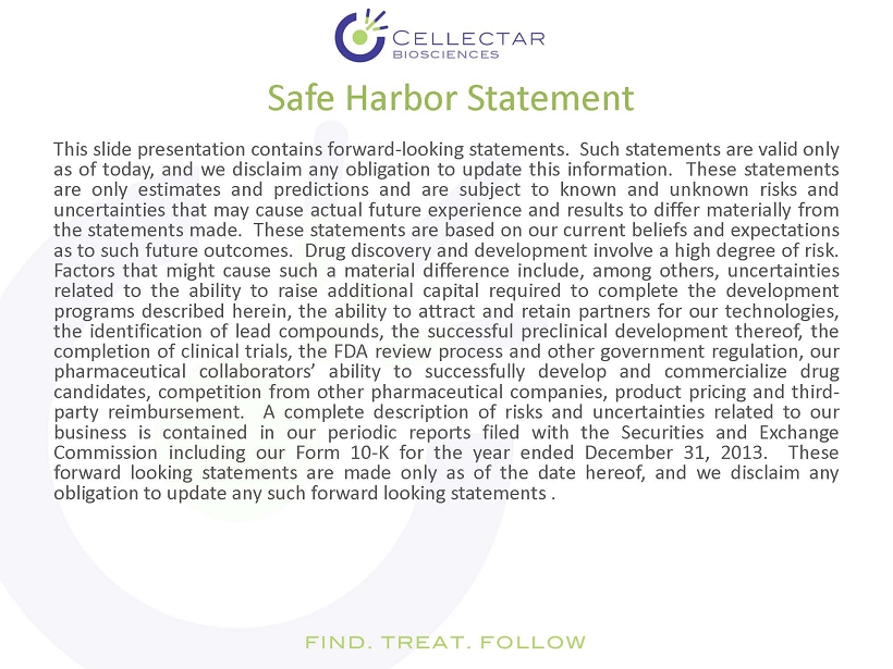 Safe Harbor Statement This slide presentation contains forward - looking statements . Such statements are valid only as of today, and we disclaim any obligation to update this information . These statements are only estimates and predictions and are subject to known and unknown risks and uncertainties that may cause actual future experience and results to differ materially from the statements made . These statements are based on our current beliefs and expectations as to such future outcomes . Drug discovery and development involve a high degree of risk . Factors that might cause such a material difference include, among others, uncertainties related to the ability to raise additional capital required to complete the development programs described herein, the ability to attract and retain partners for our technologies, the identification of lead compounds, the successful preclinical development thereof, the completion of clinical trials, the FDA review process and other government regulation, our pharmaceutical collaborators’ ability to successfully develop and commercialize drug candidates, competition from other pharmaceutical companies, product pricing and third - party reimbursement . A complete description of risks and uncertainties related to our business is contained in our periodic reports filed with the Securities and Exchange Commission including our Form 10 - K for the year ended December 31 , 2013 . These forward looking statements are made only as of the date hereof, and we disclaim any obligation to update any such forward looking statements .