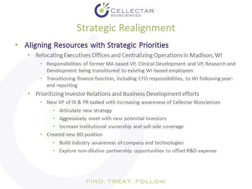 Strategic Realignment • Aligning Resources with Strategic Priorities • Relocating Executives Offices and Centralizing Operations in Madison, WI • Responsibilities of former MA based VP, Clinical Development and VP, Research and Development being transitioned to existing WI - based employees • Transitioning finance function, including CFO responsibilities, to WI following year - end reporting • Prioritizing Investor Relations and Business Development efforts • New VP of IR & PR tasked with increasing awareness of Cellectar Biosciences • Articulate new strategy • Aggressively meet with new potential investors • Increase institutional ownership and sell - side coverage • Created new BD position • Build industry awareness of company and technologies • Explore non - dilutive partnership opportunities to offset R&D expense