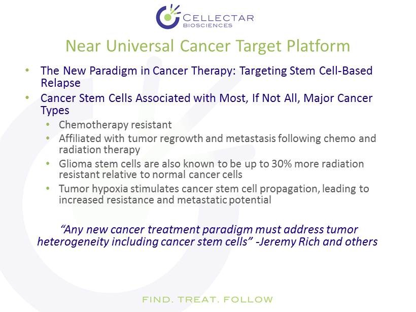 Near Universal Cancer Target Platform • The New Paradigm in Cancer Therapy: Targeting Stem Cell - Based Relapse • Cancer Stem Cells Associated with Most, If Not All, Major Cancer Types • Chemotherapy resistant • Affiliated with tumor regrowth and metastasis following chemo and radiation therapy • Glioma stem cells are also known to be up to 30% more radiation resistant relative to normal cancer cells • Tumor hypoxia stimulates cancer stem cell propagation, leading to increased resistance and metastatic potential “Any new cancer treatment paradigm must address tumor heterogeneity including cancer stem cells” - Jeremy Rich and others