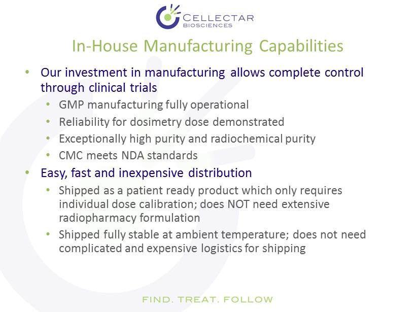 In - House Manufacturing Capabilities • Our investment in manufacturing allows complete control through clinical trials • GMP manufacturing fully operational • Reliability for dosimetry dose demonstrated • Exceptionally high purity and radiochemical purity • CMC meets NDA standards • Easy , fast and inexpensive distribution • Shipped as a patient ready product which only requires individual dose calibration; does NOT need extensive radiopharmacy formulation • Shipped fully stable at ambient temperature; does not need complicated and expensive logistics for shipping