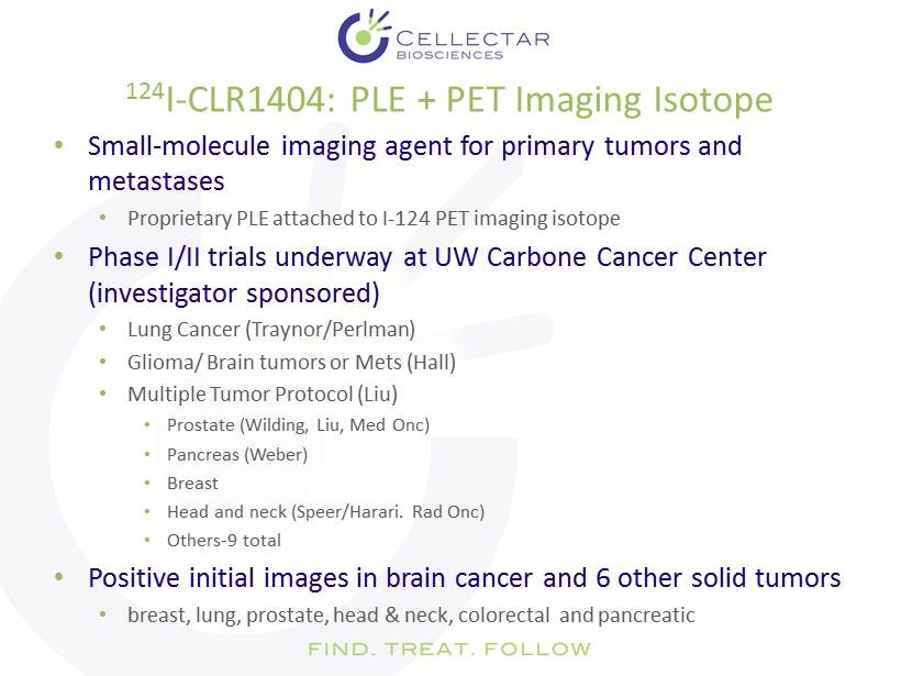 124 I - CLR1404: PLE + PET Imaging Isotope • Small - molecule imaging agent for primary tumors and metastases • Proprietary PLE attached to I - 124 PET imaging isotope • Phase I/II trials underway at UW Carbone Cancer Center ( investigator sponsored) • Lung Cancer (Traynor/Perlman) • Glioma/ Brain tumors or Mets (Hall) • Multiple Tumor Protocol (Liu) • Prostate (Wilding, Liu, Med Onc ) • Pancreas (Weber) • Breast • Head and neck ( Speer / Harari . Rad Onc ) • Others - 9 total • Positive initial images in brain cancer and 6 other solid tumors • breast, lung, prostate, head & neck, colorectal and pancreatic