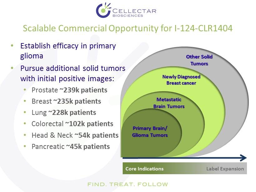 Scalable Commercial Opportunity for I - 124 - CLR1404 • Establish efficacy in primary glioma • Pursue additional solid tumors with initial positive images: • Prostate ~239k patients • Breast ~235k patients • Lung ~228k patients • Colorectal ~102k patients • Head & Neck ~54k patients • Pancreatic ~45k patients Metastatic Brain Tumors Newly Diagnosed Breast cancer Other Solid Tumors Core Indications Label Expansion Primary Brain/ Glioma Tumors