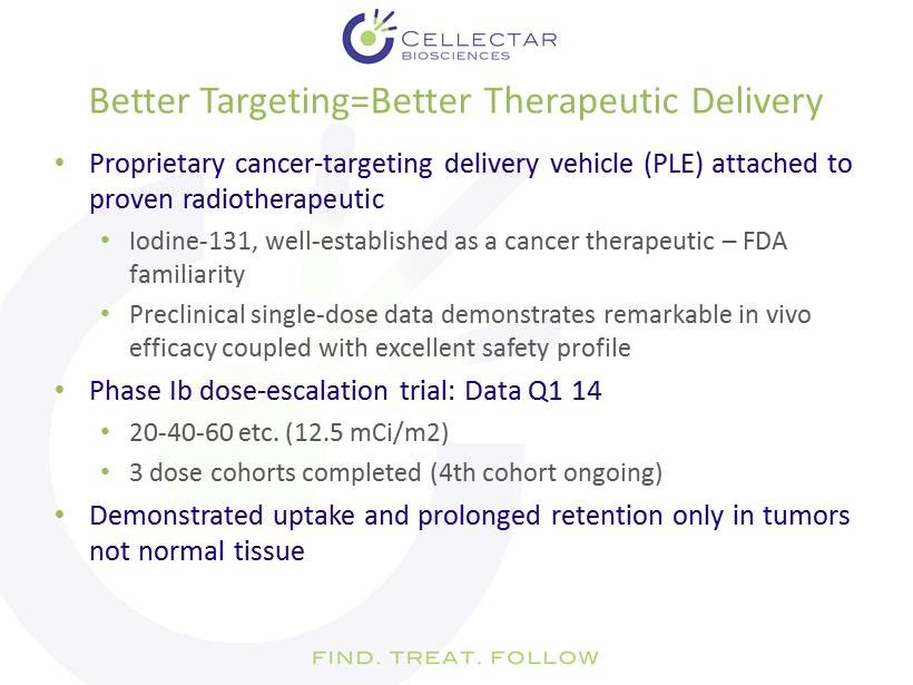 Better Targeting=Better Therapeutic Delivery • Proprietary cancer - targeting delivery vehicle (PLE) attached to proven radiotherapeutic • Iodine - 131, well - established as a cancer therapeutic – FDA familiarity • Preclinical single - dose data demonstrates remarkable in vivo efficacy coupled with excellent safety profile • Phase Ib dose - escalation trial: Data Q1 14 • 20 - 40 - 60 etc. (12.5 mCi/m2) • 3 dose cohorts completed (4th cohort ongoing) • Demonstrated uptake and prolonged retention only in tumors not normal tissue