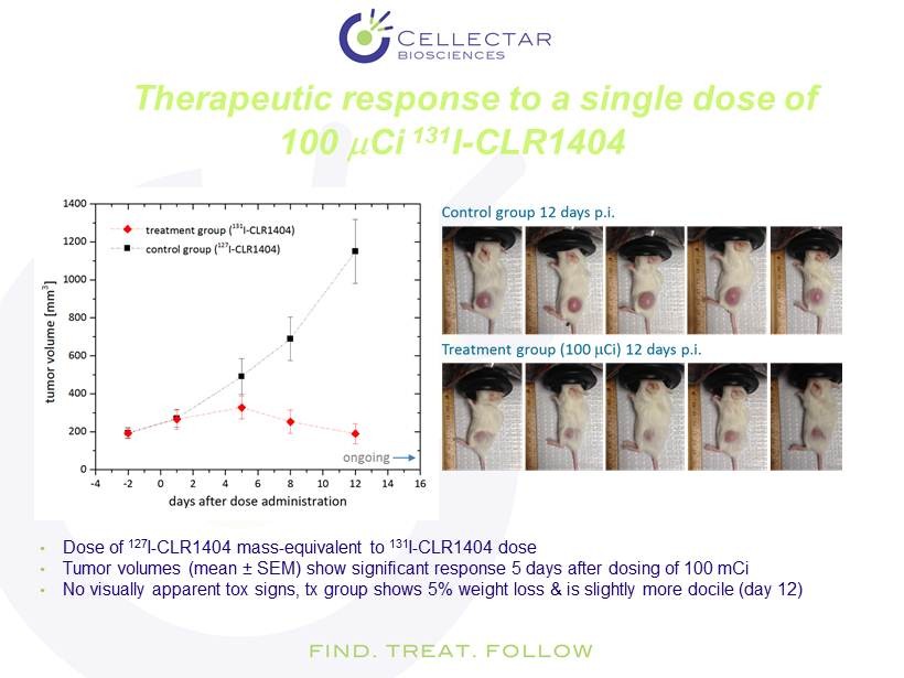Therapeutic response to a single dose of 100 m Ci 131 I - CLR1404 • Dose of 127 I - CLR1404 mass - equivalent to 131 I - CLR1404 dose • Tumor volumes (mean ± SEM) show significant response 5 days after dosing of 100 mCi • No visually apparent tox signs, tx group shows 5% weight loss & is slightly more docile (day 12)