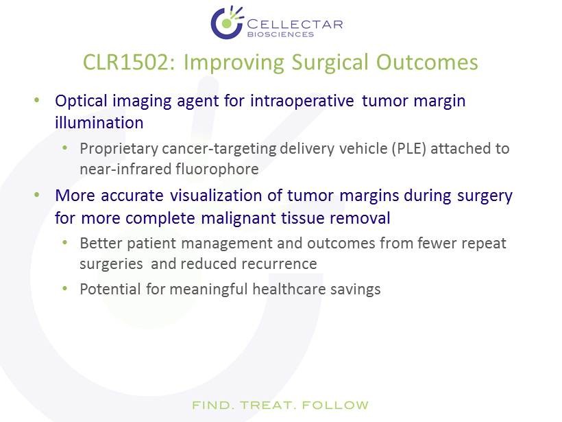 CLR1502: Improving Surgical Outcomes • Optical imaging agent for intraoperative tumor margin illumination • Proprietary cancer - targeting delivery vehicle (PLE) attached to near - infrared fluorophore • More accurate visualization of tumor margins during surgery for more complete malignant tissue removal • Better patient management and outcomes from fewer repeat surgeries and reduced recurrence • Potential for meaningful healthcare savings
