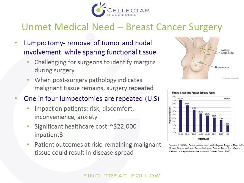 Unmet Medical Need – Breast Cancer Surgery • Lumpectomy - removal of tumor and nodal involvement while sparing functional tissue • Challenging for surgeons to identify margins during surgery • When post - surgery pathology indicates malignant tissue remains, surgery repeated • One in four lumpectomies are repeated (U.S ) • Impact on patients: risk, discomfort, inconvenience, anxiety • Significant healthcare cost: ~$22,000 inpatient3 • Patient outcomes at risk: remaining malignant tissue could result in disease spread Source: L. Wilkie , Factors Associated with Repeat Surgery After Initial Breast Conservation at Commission on Cancer Accredited Cancer Centers: A Report from the National Cancer Data (2012)