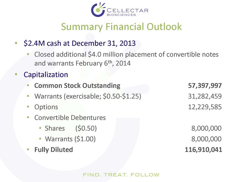 Summary Financial Outlook • $2.4M cash at December 31, 2013 • Closed additional $4.0 million placement of convertible notes and warrants February 6 th , 2014 • Capitalization • Common Stock Outstanding 57,397,997 • Warrants (exercisable; $0.50 - $1.25) 31,282,459 • Options 12,229,585 • Convertible Debentures • Shares ($0.50) 8,000,000 • Warrants ($1.00) 8,000,000 • Fully Diluted 116,910,041