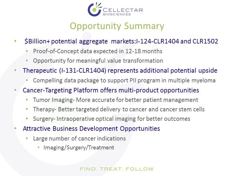Opportunity Summary • $Billion+ potential aggregate markets:I - 124 - CLR1404 and CLR1502 • Proof - of - Concept data expected in 12 - 18 months • Opportunity for meaningful value transformation • Therapeutic (I - 131 - CLR1404) represents additional potential upside • Compelling data package to support PII program in multiple myeloma • Cancer - Targeting Platform offers multi - product opportunities • Tumor Imaging - More accurate for better patient management • Therapy - Better targeted delivery to cancer and cancer stem cells • Surgery - Intraoperative optical imaging for better outcomes • Attractive Business Development Opportunities • Large number of cancer indications • Imaging/Surgery/ Treatment