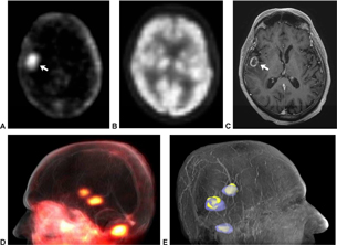 Transverse PET image (A) obtained 6 days after injection of 5 mCi I-124-CLR1404 shows a right hemispheric focus of activity (arrow) that was not detectable on 18F-FDG PET (B), but confirmed on subsequent contrast-enhanced MR (C, arrow). Fused volume-rendered I-124-CLR1404 PET-MR image (D) shows a total of three unsuspected brain metastases (2 cerebral and 1 cerebellar) that were identified on I-124-CLR1404 PET and confirmed on MR, which altered the treatment strategy for this patient. Additional fused volume-rendered I-124-CLR1404 PET-MR image (E) with segmentation of the brain metastases shows the regions of I-124-CLR1404 uptake (purple), which exceed the regions of abnormal MR contrast enhancement (yellow). The clinical significance of this uptake-enhancement discordance within the tumor is uncertain at this time but serves as the aim of the Phase 2 glioblastoma imaging trial. (Provided by Dr. Perry Pickhardt, University of Wisconsin Carbone Cancer Center)
