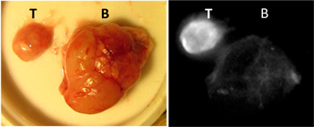Photograph (left) and near infrared image (right) of an excised mouse brain (B) and human glioma stem cell derived tumor (T) that was surgically separated from the brain under optical guidance 96 h after injection of CLR1502. Note much more optical signal emanating from the tumor relative to normal brain. (Provided by Dr. John Kuo, University of Wisconsin Carbone Cancer Center)