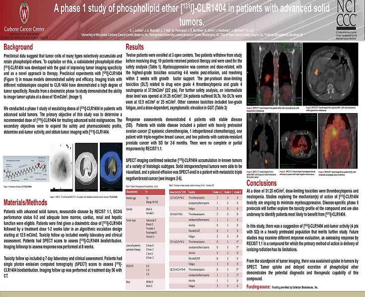 Background Materials/Methods Results Conclusions Funding source: Funding provided by Cellectar Biosciences, Inc. A phase 1 study of phospholipid ether [ 131 I] - CLR1404 in patients with advanced solid tumors. S. J. Lubner 1 , J. A. Mullvain 1 , L. T. Hall 1 , M. Pishvaian 2 , J. E. Mortimer 3 , K. Oliver 4 , J. Heideman 1 , J. Weichert 1,4 , G. Liu 1 1 University of Wisconsin Carbone Cancer Center, Madison, WI, 2 Georgetown University Lombardi Cancer Center, Washington, DC 3 City of Hope Cancer Center, Duarte, CA, 4 Cellectar Biosciences, Madison, WI Preclinical data suggest that tumor cells of many types selectively accumulate and retain phospholipid ethers . To capitalize on this, a radiolabeled phospholipid ether [ 131 I] - CLR 1404 was developed with the goal of improving tumor imaging specificity and as a novel approach to therapy . Preclinical experiments with [ 131 I] - CLR 1404 (Figure 1 ) in mouse models demonstrated safety and efficacy . Imaging trials with different radioisotopes coupled to CLR - 1404 have demonstrated a high degree of tumor specificity . Results from a dosimetric phase 1 a study demonstrated the ability to image tumor uptake at a dose of 10 mCi/m 2 . (Image 1 ) We conducted a phase 1 study of escalating doses of [ 131 I] - CLR 1404 in patients with advanced solid tumors . The primary objective of this study was to determine a recommended dose of [ 131 I] - CLR 1404 for treating advanced solid malignancies . The secondary objectives were to expand the safety and pharmacokinetic profile, determine anti - tumor activity, and obtain tumor imaging with [ 131 I] - CLR 1404 . At a dose of 31 . 25 mCi/m 2 , dose - limiting toxicities were thrombocytopenia and neutropenia . Studies exploring the mechanism(s) of action of [ 131 I] - CLR 1404 toxicity are ongoing to minimize myelosuppression . Disease - specific phase II protocols will further explore the toxicity profile of the compound and are also underway to identify patients most likely to benefit from [ 131 I] - CLR 1404 . In this study, there was a suggestion of [ 131 I] - CLR 1404 anti - tumor activity ( 4 pts with SD) in a heavily pretreated population that merits further study . Future studies may examine different response evaluation, as assessing response by RECIST 1 . 1 in a compound for which the primary method of action is delivery of ionizing radiation has its limitations . From the standpoint of tumor imaging, there was sustained uptake in tumors by SPECT . Tumor uptake and delayed excretion of phospholipid ether demonstrates the potential diagnostic and therapeutic capability of this compound . Twelve patients were enrolled at 3 open centers . Two patients withdrew from study before receiving drug ; 10 patients received protocol therapy and were used for the safety analysis (Table 1 ) . Myelosuppression was common and dose - related, with the highest - grade toxicities occurring 4 - 6 weeks post - infusion, and resolving within 2 weeks with growth factor support . The per - protocol dose - limiting toxicities (DLT) related to drug were grade 4 thrombocytopenia and grade 4 neutropenia at 37 . 5 mCi/m 2 ( 2 / 2 pts) . For further safety analysis, an intermediate dose level was opened at 31 . 25 mCi/m 2 ; 2 / 4 patients suffered DLTs . No DLTs were seen at 12 . 5 mCi/m 2 or 25 mCi/m 2 . Other common toxicities included low - grade fatigue, and a dose - dependent, asymptomatic elevation in GGT . (Table 2 ) Response assessments demonstrated 4 patients with stable disease (SD) . Patients with stable disease included a patient with heavily pretreated ovarian cancer ( 2 systemic chemotherapies, 1 intraperitoneal chemotherapy), one patient with triple - negative breast cancer, and two patients with castrate - resistant prostate cancer with SD for 2 - 6 months . There were no complete or partial responses by RECIST 1 . 1 . SPECT imaging confirmed selective [ 131 I] - CLR 1404 accumulation in known tumors of a variety of histologic subtypes . Solid intraparenchymal tumors were able to be visualized, and a pleural effusion was SPECT - avid in a patient with metastatic triple negative breast cancer (see images 2 - 6 ) . Image 2: SPECT - CT fused images from a patient (001) with colorectal cancer with lung and liver metastases. Patients with advanced solid tumors, measurable disease by RECIST 1 . 1 , ECOG performance status 0 - 2 and adequate bone marrow, cardiac, renal and hepatic function were eligible . Patients were first given a dosimetric dose of [ 131 I] - CLR 1404 followed by a treatment dose 1 - 2 weeks later in an algorithmic escalation design starting at 12 . 5 mCi/m 2 . Toxicity follow up included weekly laboratory and clinical assessment . Patients had SPECT scans to assess [ 131 I] - CLR 1404 biodistribution . Imaging followup to assess response was performed at 8 weeks . Toxicity follow up included q 7 day laboratory and clinical assessment . Patients had single photon emission computed tomography (SPECT) scans to assess [ 131 I] - CLR 1404 biodistribution . Imaging follow up was performed at treatment day 56 with CT . Characteristic N Median age 55 (Range 40 - 70) Gender Male - 5 Female - 5 Tumor type Colorectal - 3 Breast - 2 Prostate - 2 Esophageal - 2 Ovarian - 1 Lines of systemic cytotoxic therapy 3 lines: 6 2 lines: 2 1 line: 0 0 lines: 2 ECOG PS 0: 6 1: 4 2: 0 Race White - 9 Asian - 1 Dose (mCi/m 2 ) (N) Toxicity Grade 1 - 2 Grade 3 Grade 4 12.5 mCi/m 2 N=2 Thrombocytopenia 2 0 0 Leukopenia/Neutropenia 1 0 0 Fatigue 2 0 0 25 mCi/m 2 N=2 Thrombocytopenia 2 0 0 Leukopenia/Neutropenia 1 1 0 Anemia 0 1 0 Elevated GGT 0 1 0 Fatigue 2 0 0 37.5 mCi/m 2 N=2 Thrombocytopenia 0 1 1* Leukopenia/Neutropenia 0 0 2* Anemia 0 2 0 Elevated GGT 0 2 0 Fatigue 1 0 0 31.25 mCi/m 2 N=4 Thrombocytopenia 0 2 2* Leukopenia/Neutropenia 1 2 1* Anemia 1 1 0 Fatigue 3 0 0 Table 1: Patient Demographics/Characteristics (N=10) Table 2: Toxicities at least possibly related to therapy (N=10); * Denotes DLT Image 4: SPECT - CT