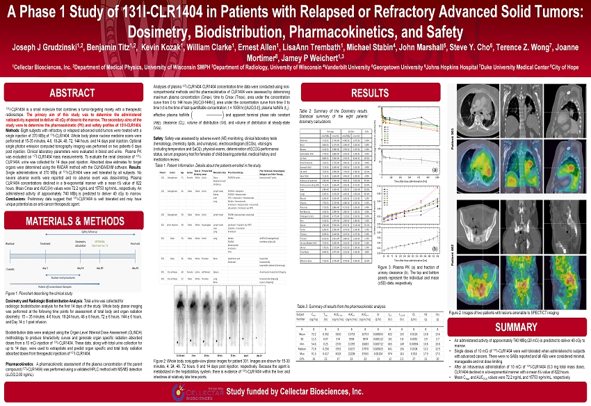 Analyses of plasma 127 I - CLR 1404 CLR 1404 concentration - time data were conducted using non - compartmental methods and the pharmacokinetics of CLR 1404 were assessed by determining maximum plasma concentration ( Cmax ), time to Cmax ( Tmax ), area under the concentration curve from 0 to 144 hours [AUC( 0 - 144 hr)], area under the concentration curve from time 0 to time t (t is the time of last quantifiable concentration ; t = 1008 hr ) [AUC( 0 - t)], plasma half - life (t ½ ), effective plasma half - life and apparent terminal phase rate constant ( λëz ), clearance (CL), volume of distribution ( Vd ), and volume of distribution at steady - state ( Vss ) . Safety : Safety was assessed by adverse event (AE) monitoring, clinical laboratory tests (hematology, chemistry, lipids, and urinalysis), electrocardiogram (ECGs), vital signs (including temperature and SaO 2 ), physical exams, determination of ECOG performance status, serum pregnancy test for females of child - bearing potential, medical history and medication review . A Phase 1 Study of 131I - CLR1404 in Patients with Relapsed or Refractory Advanced Solid Tumors: Dosimetry , Biodistribution , Pharmacokinetics, and Safety Joseph J Grudzinski 1,2 , Benjamin Titz 1,2 , Kevin Kozak 1 , William Clarke 1 , Ernest Allen 1 , LisaAnn Trembath 1 , Michael Stabin 4 , John Marshall 5 , Steve Y. Cho 6 , Terence Z. Wong 7 , Joanne Mortimer 8 , Jamey P Weichert 1,3 1 Cellectar Biosciences, Inc. 2 Department of Medical Physics, University of Wisconsin SMPH 3 Department of Radiology, University of Wisconsin 4 Vanderbilt University 5 Georgetown University 6 Johns Hopkins Hospital 7 Duke University Medical Center 8 City of Hope MATERIALS & METHODS RESULTS SUMMARY Study funded by Cellectar Biosciences, Inc. 131 I - CLR 1404 is a small molecule that combines a tumor - targeting moiety with a therapeutic radioisotope . The primary aim of this study was to determine the administered radioactivity expected to deliver 40 cGy of dose to the marrow . The secondary aims of the study were to determine the pharmacokinetic (PK) and safety profiles of 131 I - CLR 1404 . Methods : Eight subjects with refractory or relapsed advanced solid tumors were treated with a single injection of 370 MBq of 131 I - CLR 1404 . Whole body planar nuclear medicine scans were performed at 15 - 35 minutes, 4 - 6 , 18 - 24 , 48 , 72 , 144 hours, and 14 days post injection . Optional single photon emission computed tomography imaging was performed on two patients 6 days post injection . Clinical laboratory parameters were evaluated in blood and urine . Plasma PK was evaluated on 127 I - CLR 1404 mass measurements . To evaluate the renal clearance of 131 I - CLR 1404 , urine was collected for 14 days post injection . Absorbed dose estimates for target organs were determined using the RADAR method with the OLINDA/EXM software . Results : Single administrations of 370 MBq of 131 I - CLR 1404 were well tolerated by all subjects . No severe adverse events were reported and no adverse event was dose - limiting . Plasma CLR 1404 concentrations declined in a bi - exponential manner with a mean t½ value of 822 hours . Mean Cmax and AUC( 0 - t) values were 72 . 2 ng /mL and 15753 ng∙hr /mL, respectively . An administered activity of approximately 740 MBq is predicted to deliver 40 cGy to marrow . Conclusions : Preliminary data suggest that 131 I - CLR 1404 is well tolerated and may have unique potential as an anti - cancer therapeutic agent . ABSTRACT • An administered activity of approximately 740 MBq ( 20 mCi ) is predicted to deliver 40 cGy to marrow . • Single doses of 10 mCi of 131 I - CLR 1404 were well tolerated when administered to subjects with advanced cancers . There were no SAEs reported and all AEs were considered minimal, manageable and not dose limiting . • After an intravenous administration of 10 mCi of 131 I - CLR 1404 ( 0 . 3 mg total mass dose), CLR 1404 declined in a bi - exponential manner with a mean t½ value of 822 hours . • Mean C max and AUC ( 0 - t) values were 72 . 2 ng /mL and 15753 ng • hr /mL, respectively . Siegel R, Naishadham D, Jemal A. Cancer Statistics , 2013. CA Cancer J Clin. 2013;63(1):11 – 30. doi:10.3322/caac.21166. 2. LAG R, Melbert D, Krapcho M, et al. SEER Cancer Statistics Review, 1975 - 2005. 2008. Available at: http://seer.cancer.gov/csr /1975_2005/. 3. Pinchuk AN, Rampy MA, Longino MA, et al. Synthesis and structure - activity relationship effects on the tumor avidity of radio iodinated phospholipid ether analogues. J Med Chem. 2006;49(7):2155 – 2165. Available at: http://www.ncbi.nlm.nih.gov/entrez/query.fcgi?cmd=Retrieve&db=PubMed&dopt=Citation&list_uids=16570911. 4. Deming D a, Leystra A a, Farhoud M, et al. mTOR inhibition elicits a dramatic response in PI3K - dependent colon cancers. PLoS One. 2013;8(4):e60709. doi:10.1371/journal.pone.0060709. 5. Zasadny KR, Longino MA, Fisher SJ, Counsell RE, Wahl RL. A Phospholipid Ether Agent for Tumor Imaging and Possible Therapy. J Nucl Med. 1999;40:39. 6. Weichert JP. Alkylphosphocholine Analogs for broad Spectrum Cancer Imaging and Therapy. Sci Transl Med. 2013. 7. Stabin MG, Siegel JA. Physical Models and Dose Factors for Use in Internal Dose Assessment. Heal Phys. 2003;85(3):294 – 310. A vailable at: http://journals.lww.com/health - physics/Fulltext/2003/09000/Physical_Models_and_Dose_Factors_for_Use_in.6.aspx. 8. Siegel JA, Thomas SR, Stubbs JB, et al. MIRD pamphlet no. 16: Techniques for quantitative radiopharmaceutical biodistributio n data acquisition and analysis for use in human radiation dose estimates. J Nucl Med. 1999;40(2):37S – 61S. Available at: http://www.ncbi.nlm.nih.gov/entrez/query.fcgi?cmd=Retrieve&db=PubMed&dopt=Citation&list_uids=1 0025848. 9. Barrett PH, Bell BM, Cobelli C, et al. SAAM II: Simulation, Analysis, and Modeling Software for tracer and pharmacokinetic s tudies. Metabolism. 1998;47(4):484 – 92. Available at: http://www.ncbi.nlm.nih.gov/pu