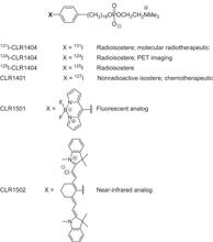 CLR1404 could be synthesized as a radioactive compound (125I, 124I, or 131I), as a fluorescent analog (CLR1501), or as a near-infrared analog (CLR1502).