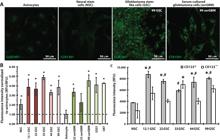 (A) GSCs (line 99) were treated overnight with CLR1501. CLR1501 uptake was visualized with confocal microscopy and compared to matched serGBM, normal human astrocytes, and human NSCs. (B) Flow cytometry was performed to quantify CLR1501 uptake after 24 hours in GSC patient–specific lines 12.1, 22, 33, 44, and 99; serGBM lines 22, 33, 99, U251, and U87; NSCs; and astrocytes. Data are means ± SD of three independent experiments. *P < 0.05, Student’s t test compared to astrocyte. RFU, relative fluorescence unit. (C) CLR1501 labeling of the CD133+ subpopulation of GSCs was analyzed using flow cytometry. Data are means ± SD of three independent experiments. *P < 0.05 versus line-matched CD133+ or CD133− cells; #P < 0.05 versus NSCs, Student’s t test.