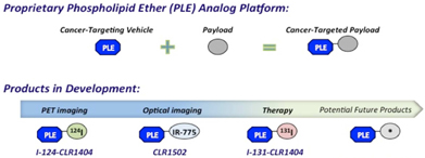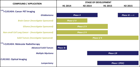 | · | I-124-CLR1404 is a small-molecule, broad-spectrum, cancer-targeting positron emission tomography (PET) imaging agent that we believe has the potential to be the first of its kind for the selective detection of tumors and metastases in a broad range of cancers. Investigator-sponsored Phase 1/2 clinical trials of I-124-CLR1404 are ongoing across 11 solid tumor indications. In March 2014, we commenced enrollment in a Phase 2 clinical trial studying I-124-CLR1404 in the imaging of glioblastoma, a type of glioma. We expect to complete this trial by the end of 2014, subject to additional funding. In April 2014, the U.S. Food and Drug Administration (FDA) granted I-124-CLR1404 orphan status as a diagnostic for the management of glioma. |