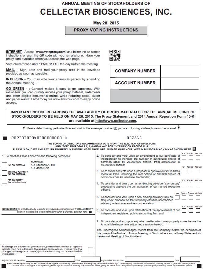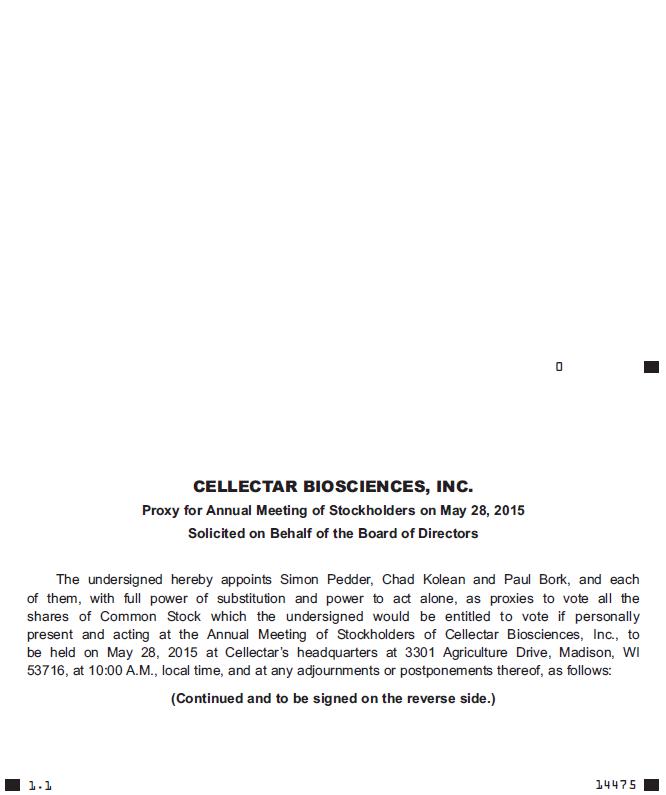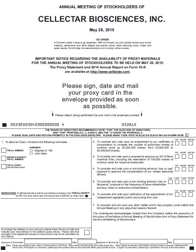 The Annual Meeting of Stockholders of Cellectar Biosciences, Inc. will be held on Thursday, May 28, 2015 at 10:00 A.M., local time, at its headquarters at 3301 Agriculture Drive, Madison, WI 53716, for the following purposes: