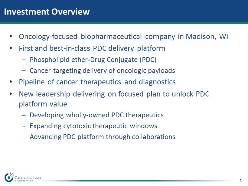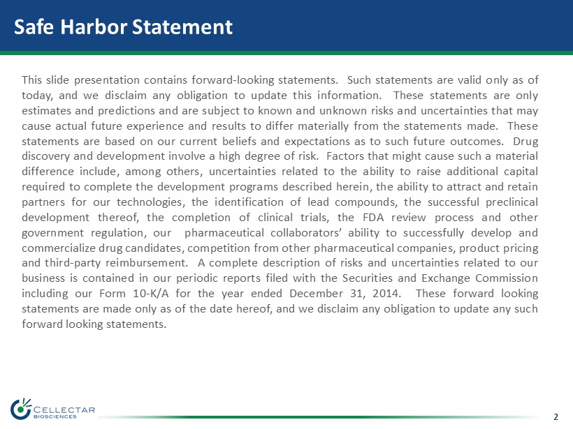 2 Safe Harbor Statement This slide presentation contains forward - looking statements . Such statements are valid only as of today, and we disclaim any obligation to update this information . These statements are only estimates and predictions and are subject to known and unknown risks and uncertainties that may cause actual future experience and results to differ materially from the statements made . These statements are based on our current beliefs and expectations as to such future outcomes . Drug discovery and development involve a high degree of risk . Factors that might cause such a material difference include, among others, uncertainties related to the ability to raise additional capital required to complete the development programs described herein, the ability to attract and retain partners for our technologies, the identification of lead compounds, the successful preclinical development thereof, the completion of clinical trials, the FDA review process and other government regulation, our pharmaceutical collaborators’ ability to successfully develop and commercialize drug candidates, competition from other pharmaceutical companies, product pricing and third - party reimbursement . A complete description of risks and uncertainties related to our business is contained in our periodic reports filed with the Securities and Exchange Commission including our Form 10 - K/A for the year ended December 31 , 2014 . These forward looking statements are made only as of the date hereof, and we disclaim any obligation to update any such forward looking statements .