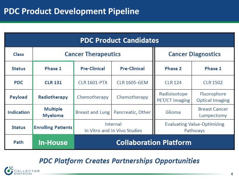 3 Investment Overview • Oncology - focused biopharmaceutical company in Madison, WI • First and best - in - class PDC delivery platform – Phospholipid ether - Drug Conjugate (PDC) – Cancer - targeting delivery of oncologic payloads • Pipeline of cancer therapeutics and diagnostics • New leadership delivering on focused plan to unlock PDC platform value – Developing wholly - owned PDC therapeutics – Expanding cytotoxic therapeutic windows – Advancing PDC platform through collaborations