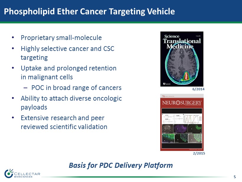 4 PDC Product Development Pipeline PDC Product Candidates Class Cancer Therapeutics Cancer Diagnostics Status Phase 1 Pre - Clinical Pre - Clinical Phase 2 Phase 1 PDC CLR 131 CLR 1601 - PTX CLR 1605 - GEM CLR 124 CLR 1502 Payload Radiotherapy Chemotherapy Chemotherapy Radioisotope PET/CT Imaging Fluorophore Optical Imaging Indication Multiple Myeloma Breast and Lung Pancreatic, Other Glioma Breast Cancer Lumpectomy Status Enrolling Patients Internal In Vitro and In Vivo Studies Evaluating Value - Optimizing Pathways Path In - House Collaboration Platform PDC Platform Creates Partnerships Opportunities