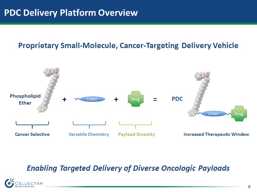 5 • Proprietary small - molecule • Highly selective cancer and CSC targeting • Uptake and prolonged retention in malignant cells – POC in broad range of cancers • Ability to attach diverse oncologic payloads • Extensive research and peer reviewed scientific validation Basis for PDC Delivery Platform Phospholipid Ether Cancer Targeting Vehicle 6/2014 2/2015