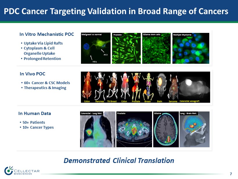 6 Proprietary Small - Molecule, Cancer - Targeting Delivery Vehicle PDC D elivery Platform Overview + + Linker = Increased Therapeutic Window Drug Linker Drug Phospholipid Ether Enabling Targeted Delivery of Diverse Oncologic Payloads PDC Cancer Selective Versatile Chemistry Payload Diversity