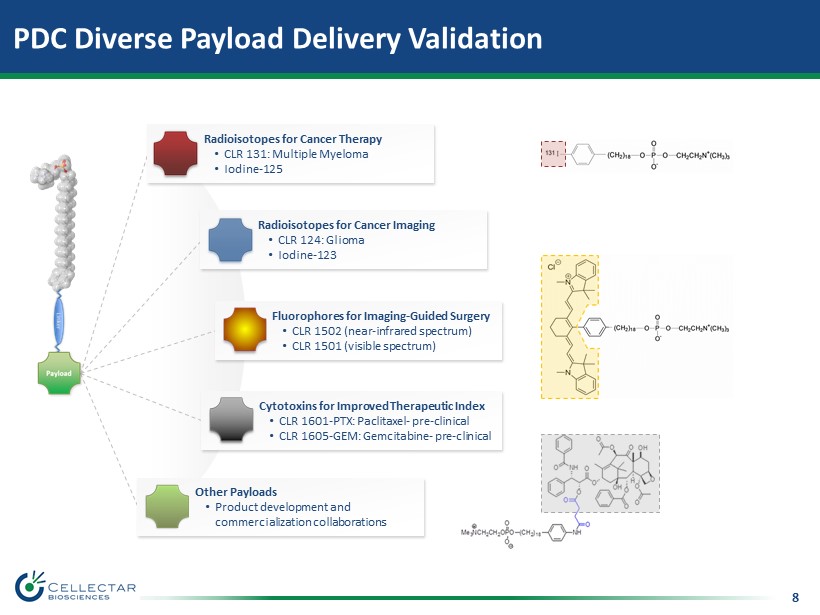 7 PDC Cancer Targeting Validation in Broad Range of Cancers Demonstrated Clinical Translation In Vitro Mechanistic POC • Uptake Via Lipid Rafts • Cytoplasm & Cell Organelle Uptake • Prolonged Retention In Vivo POC • 60+ Cancer & CSC Models • Therapeutics & Imaging In Human Data • 50+ Patients • 10+ Cancer Types Colorectal - Lung Met. Prostate Glioma Lung - Brain Met. Multiple Myeloma Malignant vs normal Glioma stem cells Colorectal xenograft Prostate