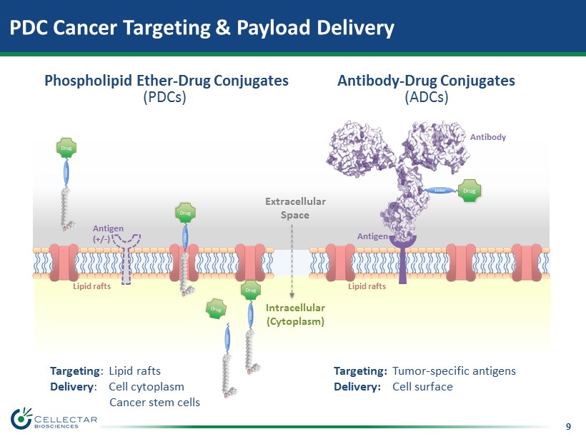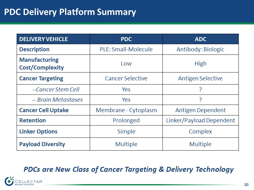 9 PDC Cancer Targeting & Payload Delivery Antibody - Drug Conjugates (ADCs) Phospholipid Ether - Drug Conjugates (PDCs) Extracellular Space Intracellular (Cytoplasm) Antigen Antibody Lipid rafts Lipid rafts Antigen (+/ - ) Targeting : Lipid rafts Delivery : Cell cytoplasm Cancer stem cells Targeting: Tumor - specific antigens Delivery: Cell s urface