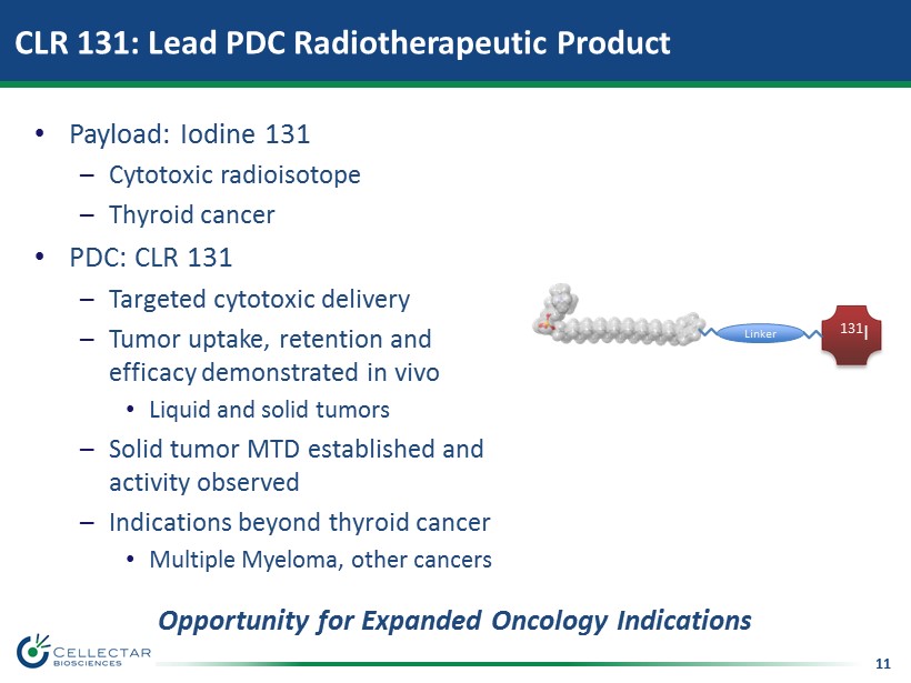 10 PDC Delivery Platform Summary DELIVERY VEHICLE PDC ADC Description PLE: Small - Molecule Antibody: Biologic Manufacturing Cost/Complexity Low High Cancer Targeting Cancer Selective Antigen Selective -- Cancer Stem Cell Yes ? -- Brain Metastases Yes ? Cancer Cell Uptake Membrane - Cytoplasm Antigen Dependent Retention Prolonged Linker/Payload Dependent Linker Options Simple Complex Payload Diversity Multiple Multiple PDCs are New Class of Cancer Targeting & Delivery Technology