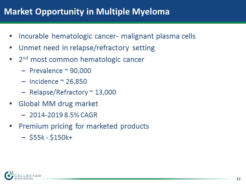 12 Market Opportunity in Multiple Myeloma • Incurable hematologic cancer - malignant plasma cells • Unmet need in relapse/refractory setting • 2 nd most common hematologic cancer – Prevalence ~ 90,000 – Incidence ~ 26,850 – Relapse/Refractory ~ 13,000 • Global MM drug m arket – 2014 - 2019 8.5% CAGR • Premium pricing for marketed products – $55k - $ 150k +