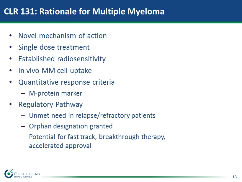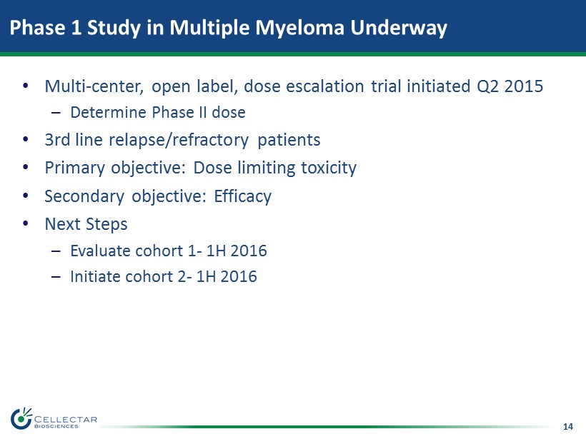 13 CLR 131: Rationale for Multiple Myeloma • Novel mechanism of action • Single dose treatment • Established radiosensitivity • In vivo MM cell uptake • Quantitative response criteria – M - protein marker • Regulatory Pathway – Unmet need in relapse/refractory patients – Orphan designation granted – Potential for fast track, breakthrough t herapy, accelerated a pproval