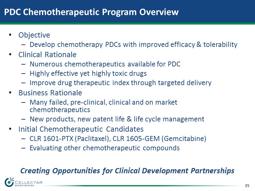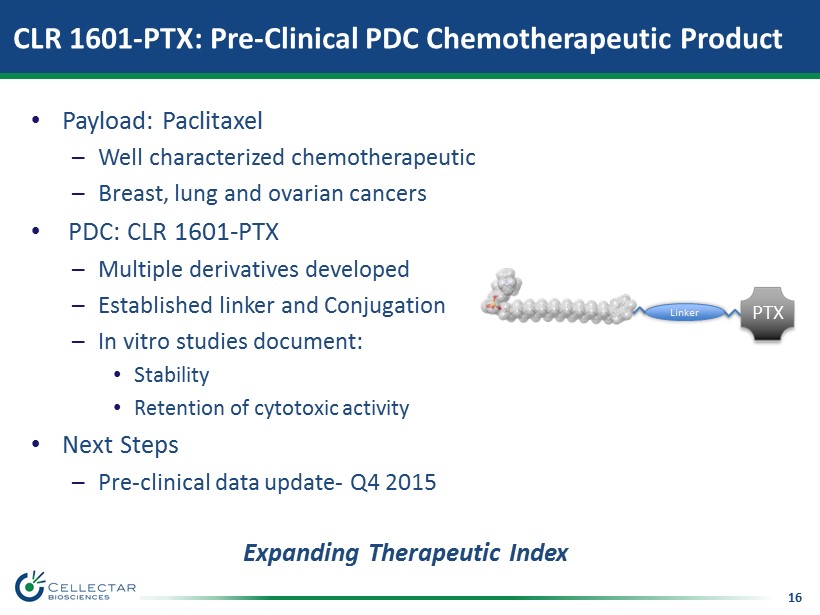 15 PDC Chemotherapeutic Program Overview • Objective – Develop chemotherapy PDCs with improved efficacy & tolerability • Clinical Rationale – Numerous chemotherapeutics available for PDC – Highly effective yet highly toxic drugs – Improve drug therapeutic index through targeted delivery • Business Rationale – Many failed, pre - clinical, clinical and on market chemotherapeutics – New products, new patent life & life cycle management • Initial Chemotherapeutic Candidates – CLR 1601 - PTX (Paclitaxel), CLR 1605 - GEM (Gemcitabine) – Evaluating other chemotherapeutic compounds Creating Opportunities for Clinical Development Partnerships