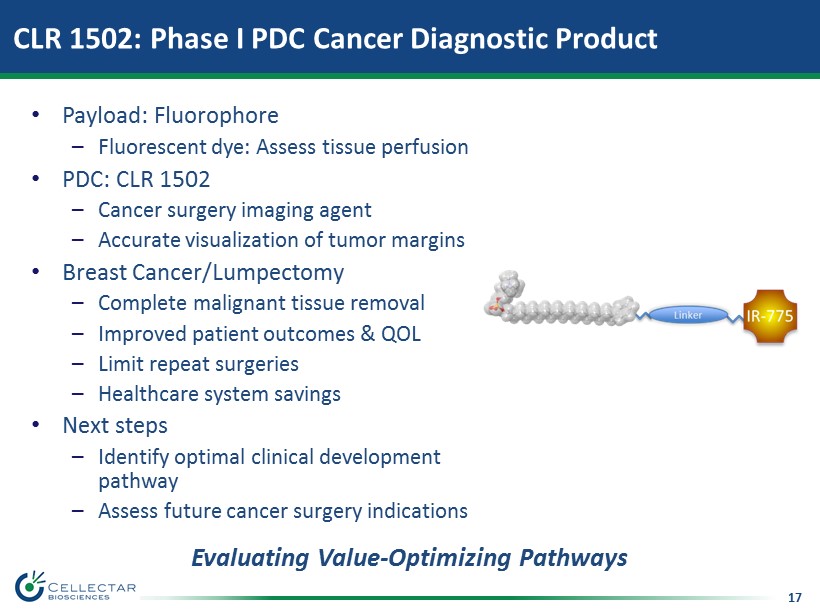 16 CLR 1601 - PTX: Pre - Clinical PDC Chemotherapeutic Product • Payload: Paclitaxel – Well characterized chemotherapeutic – Breast, lung and ovarian cancers • PDC: CLR 1601 - PTX – Multiple derivatives developed – Established linker and Conjugation – I n vitro studies document: • Stability • Retention of cytotoxic activity • Next Steps – Pre - clinical data update - Q4 2015 Expanding Therapeutic Index Linker PTX