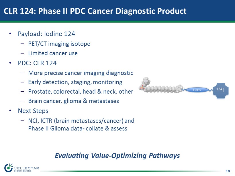 17 CLR 1502: Phase I PDC Cancer Diagnostic Product • Payload: Fluorophore – Fluorescent dye: Assess tissue perfusion • PDC: CLR 1502 – Cancer surgery i maging agent – Accurate visualization of tumor margins • Breast Cancer/Lumpectomy – Complete malignant tissue removal – Improved patient outcomes & QOL – Limit repeat surgeries – Healthcare system savings • Next steps – Identify optimal clinical development pathway – Assess future cancer surgery indications Evaluating Value - Optimizing Pathways