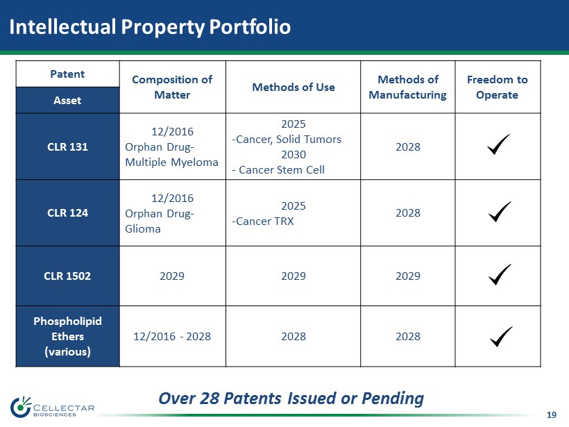 18 CLR 124: Phase II PDC Cancer Diagnostic Product • Payload: Iodine 124 – PET/CT imaging isotope – Limited cancer use • PDC: CLR 124 – More precise cancer imaging diagnostic – Early detection, staging, monitoring – Prostate , colorectal, head & neck , other – Brain cancer, glioma & metastases • Next Steps – NCI, ICTR (brain metastases/cancer) and Phase II Glioma data - collate & assess Evaluating Value - Optimizing Pathways 124