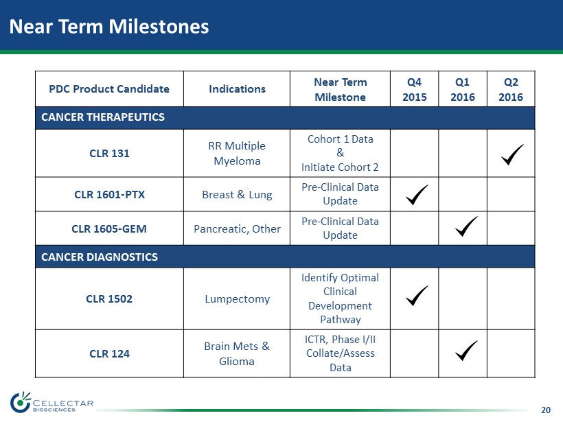 19 Intellectual Property Portfolio Patent Composition of Matter Methods of Use Methods of Manufacturing Freedom to Operate Asset CLR 131 12/2016 Orphan Drug - Multiple Myeloma 2025 - Cancer, Solid Tumors 2030 - Cancer Stem Cell 2028 CLR 124 12/2016 Orphan Drug - Glioma 2025 - Cancer TRX 2028 CLR 1502 2029 2029 2029 Phospholipid Ethers (various) 12/2016 - 2028 2028 2028 Over 28 Patents Issued or Pending