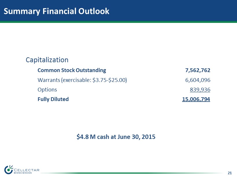 20 Near Term Milestones PDC Product Candidate Indications Near Term Milestone Q4 2015 Q1 2016 Q2 2016 CANCER THERAPEUTICS CLR 131 RR Multiple Myeloma Cohort 1 Data & Initiate Cohort 2 CLR 1601 - PTX Breast & Lung Pre - Clinical Data Update CLR 1605 - GEM Pancreatic, Other Pre - Clinical Data Update CANCER DIAGNOSTICS CLR 1502 Lumpectomy Identify Optimal Clinical Development Pathway CLR 124 Brain Mets & Glioma ICTR, Phase I/II Collate/Assess Data