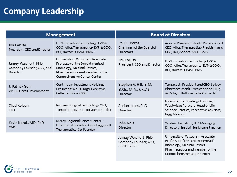 22 Company Leadership Management Jim Caruso President, CEO and Director HIP Innovation Technology - EVP & COO; Allos Therapeutics - EVP & COO; BCI, Novartis, BASF, BMS Jamey Weichert, PhD Company Founder, CSO, and Director University of Wisconsin Associate Professor of the Departments of Radiology, Medical Physics, Pharmaceutics and member of the Comprehensive Cancer Center J. Patrick Genn VP, Business Development Continuum Investment Holdings - President; Wells Fargo - Executive, Cellectar since 2006 Chad Kolean CFO Pioneer Surgical Technology - CFO; TomoTherapy – Corporate Controller Kevin Kozak, MD, PhD CMO Mercy Regional Cancer Center - Director of Radiation Oncology; Co - D Therapeutics - Co - Founder Board of Directors Paul L. Berns Chairman of the Board of Directors Anacor Pharmaceuticals - President and CEO; Allos Therapeutics - President and CEO; BCI, Abbott, BASF, BMS Jim Caruso President, CEO and Director HIP Innovation Technology - EVP & COO; Allos Therapeutics - EVP & COO; BCI, Novartis, BASF, BMS Stephen A. Hill , B.M. B.Ch., M.A., F.R.C.S Director Targacept - President and CEO; Solvay Pharmaceuticals - President and CEO; ArQule, F. Hoffmann - La Roche Ltd. Stefan Loren, PhD Director Loren Capital Strategy - Founder; Westwicke Partners - Head of Life Science Practice; Perceptive Advisors, Legg Mason John Neis Director Venture Investors, LLC; Managing Director, Head of Healthcare Practice Jamey Weichert, PhD Company Founder, CSO, and Director University of Wisconsin Associate Professor of the Departments of Radiology, Medical Physics, Pharmaceutics and member of the Comprehensive Cancer Center