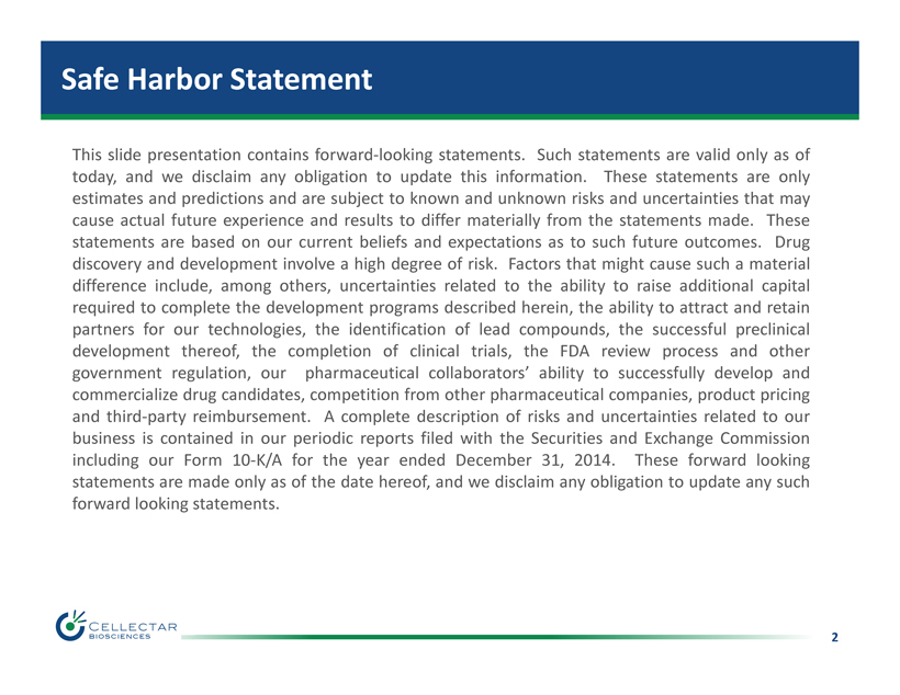 2 Safe Harbor Statement This slide presentation contains forward - looking statements . Such statements are valid only as of today, and we disclaim any obligation to update this information . These statements are only estimates and predictions and are subject to known and unknown risks and uncertainties that may cause actual future experience and results to differ materially from the statements made . These statements are based on our current beliefs and expectations as to such future outcomes . Drug discovery and development involve a high degree of risk . Factors that might cause such a material difference include, among others, uncertainties related to the ability to raise additional capital required to complete the development programs described herein, the ability to attract and retain partners for our technologies, the identification of lead compounds, the successful preclinical development thereof, the completion of clinical trials, the FDA review process and other government regulation, our pharmaceutical collaborators’ ability to successfully develop and commercialize drug candidates, competition from other pharmaceutical companies, product pricing and third - party reimbursement . A complete description of risks and uncertainties related to our business is contained in our periodic reports filed with the Securities and Exchange Commission including our Form 10 - K/A for the year ended December 31 , 2014 . These forward looking statements are made only as of the date hereof, and we disclaim any obligation to update any such forward looking statements .