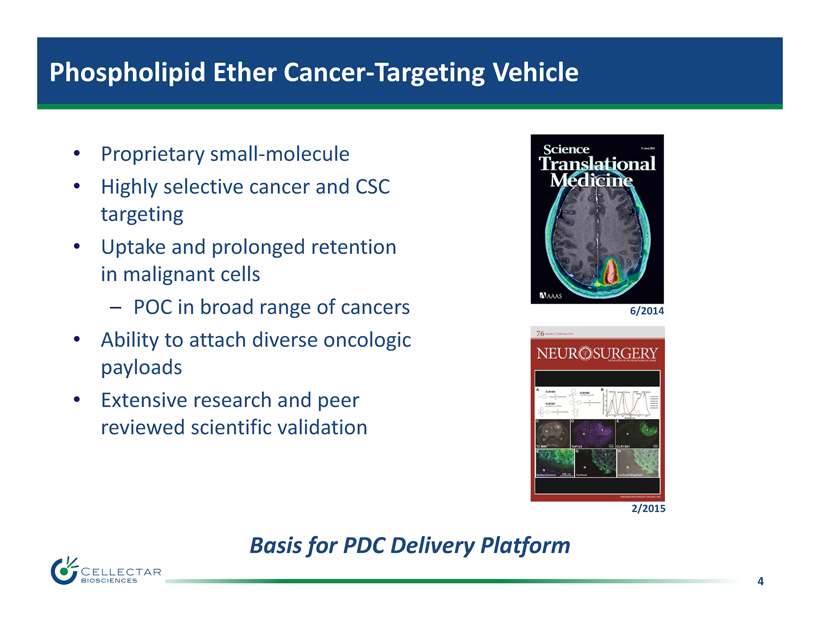 3 Investment Overview • Oncology - focused biopharmaceutical company in Madison, WI • Phospholipid Drug Conjugate (PDC) Delivery P latform – Phospholipid Ether cancer - targeting v ehicle – Enables delivery of diverse oncologic payloads – Increases payload therapeutic window • Pipeline of PDC cancer therapeutics and diagnostics • Focused plan to unlock PDC Delivery Platform value – Advance CLR 131 therapeutic franchise – Develop early - stage chemotherapeutic conjugates – Expand PDC pipeline through collaborations