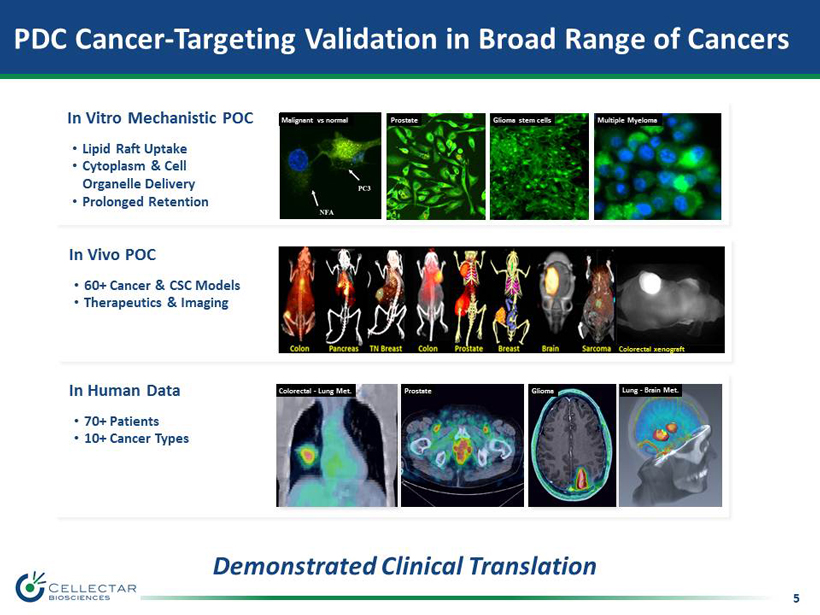 4 • Proprietary small - molecule • Highly selective cancer and CSC targeting • Uptake and prolonged retention in malignant cells – POC in broad range of cancers • Ability to attach diverse oncologic payloads • Extensive research and peer reviewed scientific validation Basis for PDC Delivery Platform Phospholipid Ether Cancer - Targeting Vehicle 6/2014 2/2015