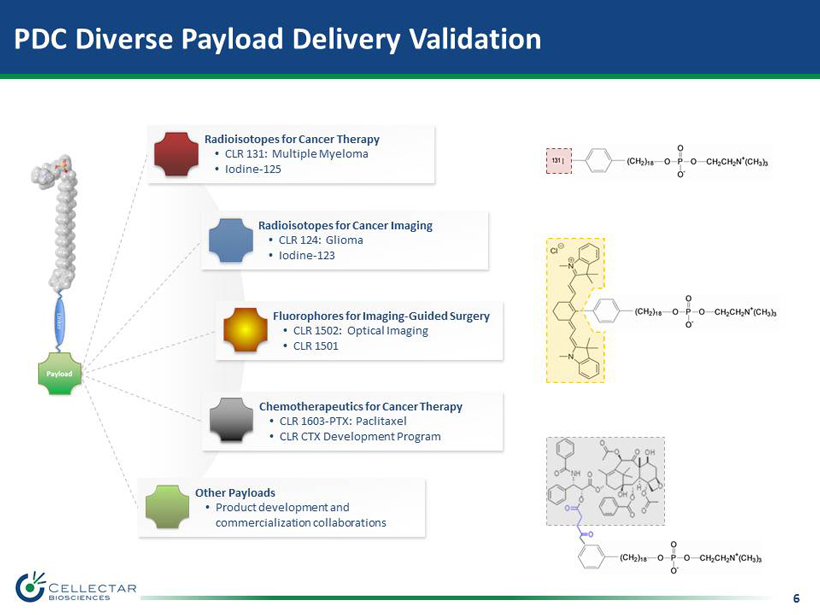 5 PDC Cancer - Targeting Validation in Broad Range of Cancers Demonstrated Clinical Translation In Vitro Mechanistic POC • Lipid Raft Uptake • Cytoplasm & Cell Organelle Delivery • Prolonged Retention In Vivo POC • 60 + Cancer & CSC Models • Therapeutics & Imaging In Human Data • 70 + Patients • 10+ Cancer Types Colorectal - Lung Met. Prostate Glioma Lung - Brain Met. Multiple Myeloma Malignant vs normal Glioma stem cells Colorectal xenograft Prostate
