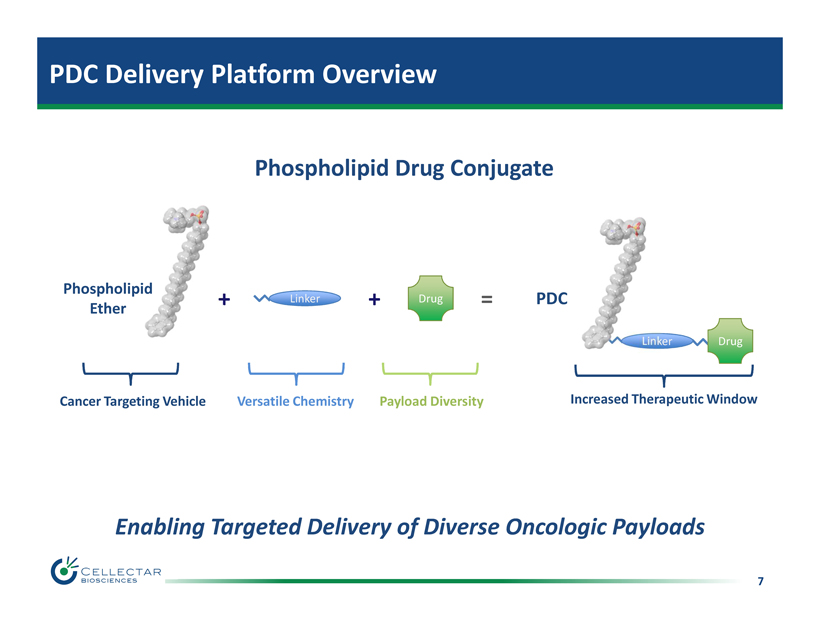 6 PDC Diverse Payload Delivery Validation Radioisotopes for Cancer Imaging • CLR 124: Glioma • Iodine - 123 Fluorophores for Imaging - Guided Surgery • CLR 1502: Optical Imaging • CLR 1501 Chemotherapeutics for Cancer Therapy • CLR 1603 - PTX: Paclitaxel • CLR CTX Development Program Other Payloads • Product development and commercialization collaborations Radioisotopes for Cancer Therapy • CLR 131: Multiple Myeloma • Iodine - 125