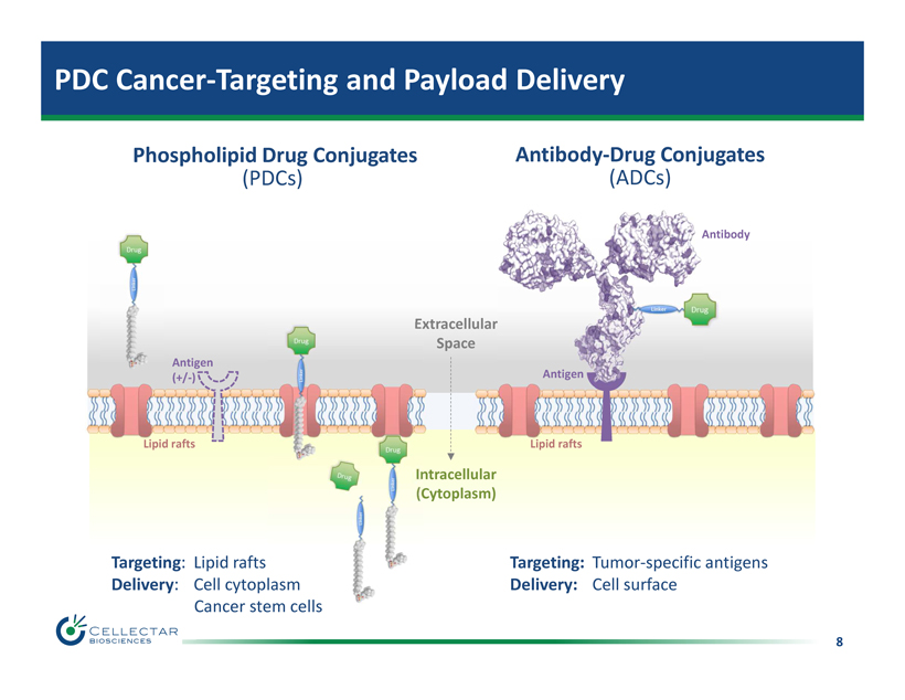7 PDC D elivery Platform Overview + + Linker = Increased Therapeutic Window Drug Linker Drug Phospholipid Ether Enabling Targeted Delivery of Diverse Oncologic Payloads PDC Cancer Targeting Vehicle Versatile Chemistry Payload Diversity Phospholipid Drug Conjugate