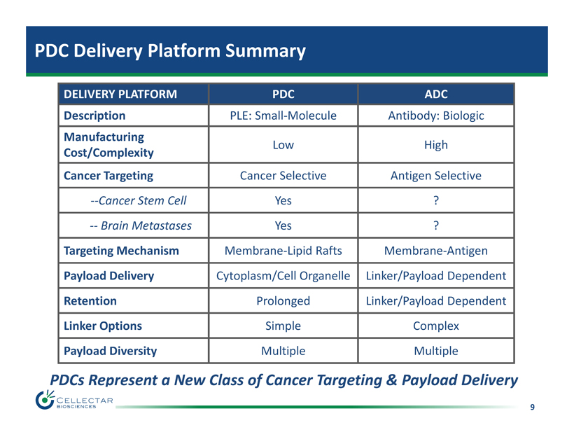 8 PDC Cancer - Targeting and Payload Delivery Antibody - Drug Conjugates (ADCs) Phospholipid Drug Conjugates (PDCs) Extracellular Space Intracellular (Cytoplasm) Antigen Antibody Lipid rafts Lipid rafts Antigen (+/ - ) Targeting : Lipid rafts Delivery : Cell cytoplasm Cancer stem cells Targeting: Tumor - specific antigens Delivery: Cell s urface