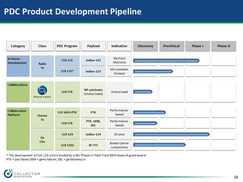 9 PDCs Represent a New Class of Cancer Targeting & Payload Delivery PDC Delivery Platform Summary DELIVERY PLATFORM PDC ADC Description PLE: Small - Molecule Antibody: Biologic Manufacturing Cost/Complexity Low High Cancer Targeting Cancer Selective Antigen Selective -- Cancer Stem Cell Yes ? -- Brain Metastases Yes ? Targeting Mechanism Membrane - Lipid Rafts Membrane - Antigen Payload Delivery Cytoplasm/Cell Organelle Linker/Payload Dependent Retention Prolonged Linker/Payload Dependent Linker Options Simple Complex Payload Diversity Multiple Multiple